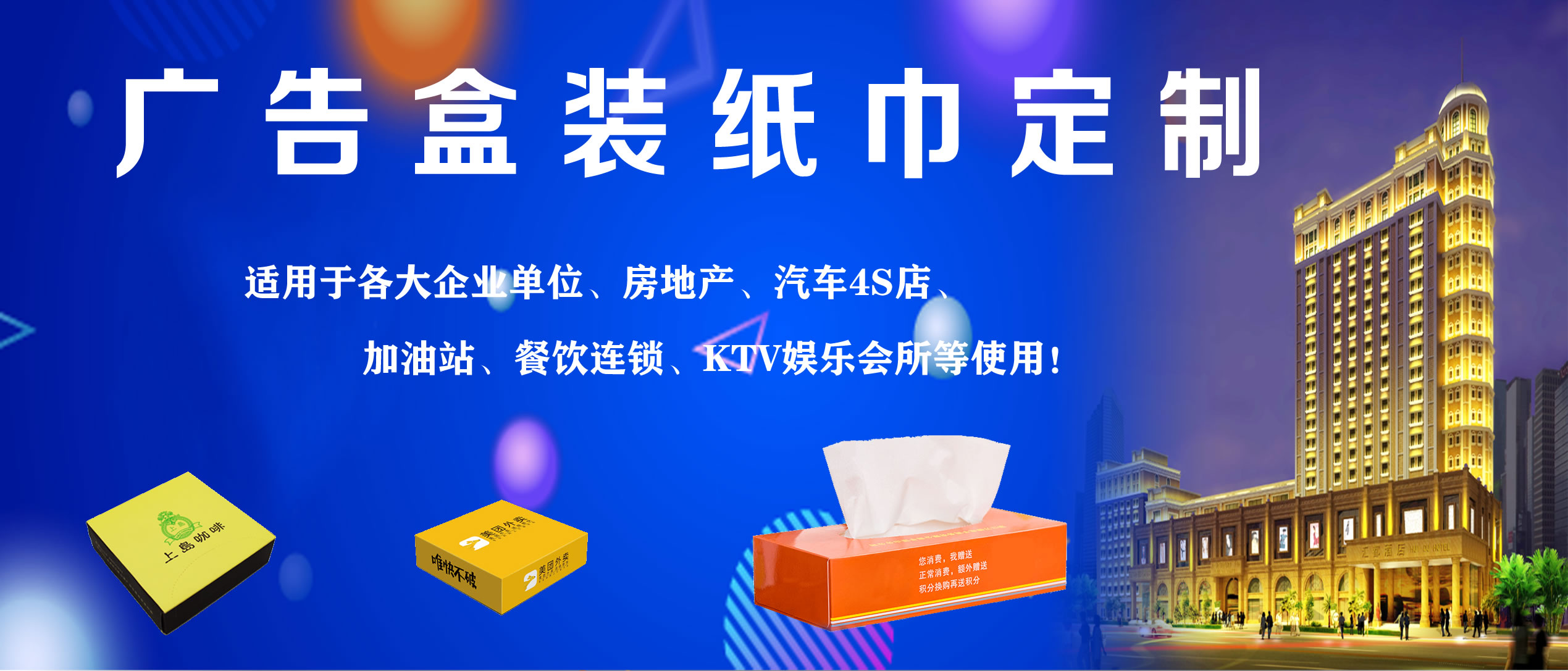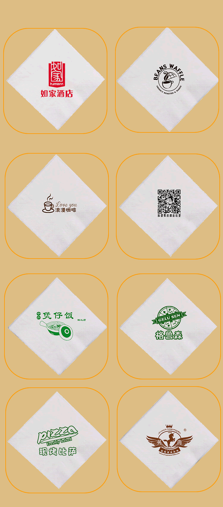 合肥億竹紙品包裝有限公司是一家專業(yè)從事各種生活用品定制的企業(yè),定制熱線:18919603840(周經(jīng)理)。公司與各大餐飲行業(yè)、酒店、加油站、學(xué)校、KTV娛樂會(huì)所、銀行、汽車4S店、房地產(chǎn)、廣告公司等客戶長期合作,業(yè)務(wù)覆蓋安徽全省。公司主營產(chǎn)品:廣告盒抽定制、餐巾紙定制、大盤紙、擦手紙、散抽紙等。有著完善的生產(chǎn)硬件設(shè)備和專業(yè)技術(shù),及長期從事的豐富經(jīng)驗(yàn)。 我廠專注生活用品多年,致力于生產(chǎn)“精致,高端,綠色,健康”于一體的優(yōu)質(zhì)產(chǎn)品,以誠信、實(shí)力和產(chǎn)品質(zhì)量獲得業(yè)界的認(rèn)可。目前我廠產(chǎn)品已深得寶馬汽車、重慶劉一手火鍋餐飲連鎖、萬達(dá)集團(tuán)、綠地集團(tuán)等眾多客戶的青睞,業(yè)務(wù)量不斷攀升。